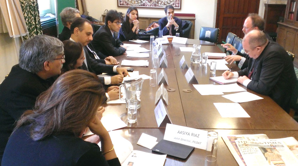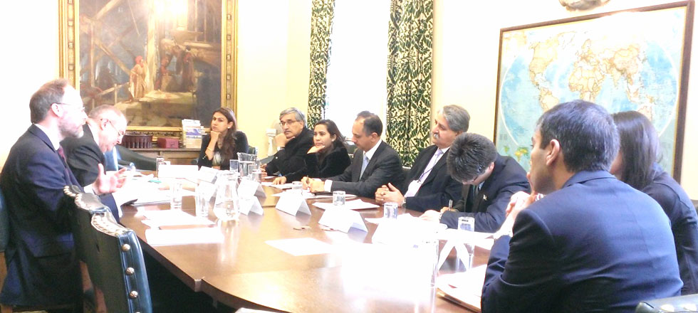 The Pakistan delegation held a detailed interaction with Mr. Andrew Stephenson, a young Member of the UK Parliament and the Chairman of All-Party Parliamentary Group (APPG) on Pakistan. Mr. Stephenson explained that coming from a constituency nearly 20 per cent of his electorate from Pakistani origin, it was an honour for him to chair the APPG on Pakistan. Mr. Stephenson shared with the delegation the roles and powers of an MP in the British political system. As UK faces an election in May 2015, many questions were raised with Mr. Stephenson regarding the electoral process in the UK. Mr. Stephenson emphasised that there exists a spending limit on electoral expenses which is strictly followed and publicly scrutinized. Roughly of about 40,000 GBP, the expense limit does not allow candidates buying airtime on electronic media. Instead, mass leaflet distribution is the most important campaigning tool. Differentiating between the role of the members of Parliaments in Pakistan and the UK, he said that in the presence of a well-established bureaucracy in the UK and a functioning system of delivery of services to citizens and voters, the UK public, unlike in Pakistan, does not expect MPs to facilitate provision of services for them. |