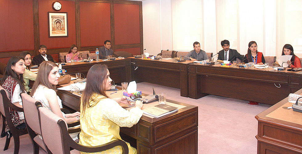 Honourable Ms. Shaza Fatima Khawaja, MNA, (NA-304, Women, Punjab XXXII, PML-N), and General Secretary YPF, welcomed the Committee members and briefed them about the work and purpose of the YPF. The YPF comprises 78 Members of the National Assembly under the age of 40 at the time of General Election 2013. Ms. Khawaja said that the YPF was proud to honour a Standing Committee of the Youth Parliament Pakistan for its outstanding performance in terms of preparing a report on a key issue and submitting reform proposals to the Government.