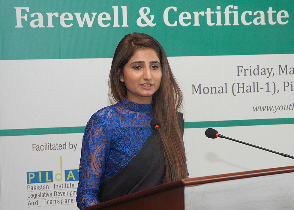 Certificates were distributed among the outgoing 6th batch of Youth Parliament Pakistan. Parliamentarians who joined the farewell and certificate distribution ceremony today included: Honourable Mr. Omar Ayub Khan, MNA (NA-19, Haripur, KP, PML-N), Honourable Ms. Maiza Hameed, MNA (NA-290, WR, Punjab- XVIII, Punjab, PML-N), Honourable Ms. Romina Khurshid Alam, MNA (NA-295, WR, Punjab- XXIII, PML-N) and Honourable Mrs. Nafeesa Inayatullah Khattak, MNA, (NA-322, Women KP – I, PTI). Member of the Steering Committee, Dr. Talib Hussain Sial was also part of the ceremony.