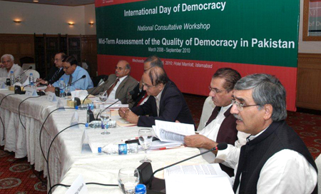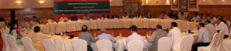 Islamabad, September 15; The Mid-Term Assessment of the Quality of Democracy in Pakistan received an average score of 45%. Released on the International Day of Democracy and at the completion of the mid-term of the tenure of elected Parliament and the Government of Pakistan (September 16 and September 24, 2010 respectively), the Democracy Assessment Group (DAG), convened by the PILDAT, carried out a comprehensive assessment based on an international democracy assessment framework reflecting the experience of democracies around the world. |