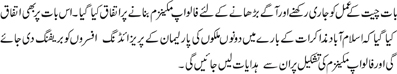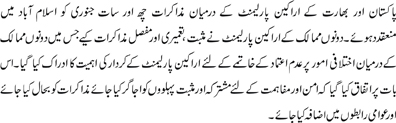 It was agreed that the presiding officers of the parliaments of the two countries would be briefed about the outcome of the Islamabad meeting and requested to advice on a follow up mechanism. |