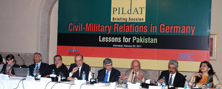 Panellists at the Briefing Session included Mr. Shahid Hamid, Senior Advocate Supreme Court of Pakistan and former Federal Minister of Defence, Establishment and Law and former Governor Punjab; Dr. Syed Riffat Hussain, Chairman, Department of Defence and Strategic Studies, Quaid-e-Azam University, Islamabad; Mr. Mujib-ur-Rehman Shami, Editor-in-Chief Daily Pakistan and former President of the Council of Pakistan Newspaper Editors; Lt. Gen. (Retd.) Abdul Qadir Baloch, MNA, former Governor Balochistan; Ms. Anja Minnaert, Resident Representative FES Pakistan; Mr. Ahmed Bilal Mehboob, Executive Director PILDAT and Ms. Aasiya Riaz, Joint Director PILDAT. Other delegates who were part of the Study Visit to Germany, namely Mr. Faisal Karim Kundi, MNA, Deputy Speaker National Assembly of Pakistan and Lt. Gen. (Retd.) Ali Muhammad Jan Aurakzai, former Governor Khyber Pakhtunkhwa province (formerly NWFP), could not join the Briefing to share their learning and experiences gained through the Study Visit to Germany that took place from November 28 - December 03, 2010.