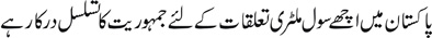> Good Civil-Military Relations in Pakistan require patience and continuation of democracy