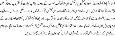 Islamabad; February 08; At the launching session of Discussion Papers on Jammu and Kashmir: Trade Across the Line of Control (LoC), panellists believed that trade and commerce across the line of control can minimize the tension and it could enhance inter- dependence on each other which could lead towards Pak-India conflict resolution. Panellists were of the view that trade across LOC is the only confidence-building measure (CBM) between Pakistan and India which directly benefits the Kashmiri people. Experts believed that people-to-people contact and trade has contributed positively on both sides of Kashmir. |