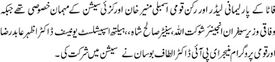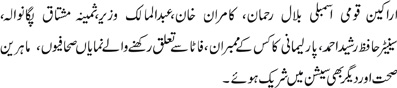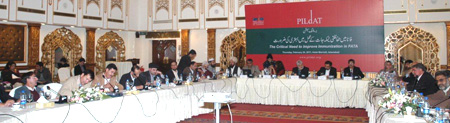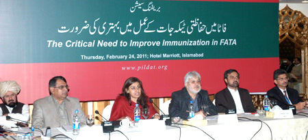 Mr. Munir Khan Orakzai MNA and Parliamentary leader FATA in the National Assembly chaired the session while he was joined by Senator Saleh Shah Quraishi, Engineer Shaukat Ullah, Federal Minister for SAFRON, Dr. Azhar Abid Raza, Health Specialist UNICEF, and Dr. Altaf Bosan, National Progamme Manager-Expanded Programme of Immunization.