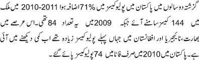 In the last 2 years, polio has had a 71% increase in Pakistan with 84 cases of polio in 2009 to 144 and rising in 2010-2011. Afghanistan, India and even Kenya, the alarming cases earlier, have seen improvements in polio reduction in this period. Of the 144 cases of polio in Pakistan in 2010, 74 occurred in FATA alone. |