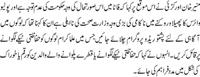 Mr. Munir Khan Orakzai said that the situation in FATA is symptomatic of lack of government�s interest in FATA. It is largely the Health administration�s inability to manage the spread of virus in FATA through immunization. He believed greater awareness campaigns need to be run in FATA using Pashto radio. Ulema need to be involved to give brief statements on radio attesting immunization while health administration should consider giving monetary or food-related incentives to parents for immunizing their children in FATA through coordinating with related agencies. |