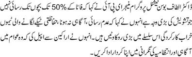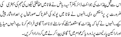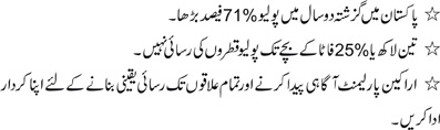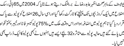 Mr. Azhar Abid Raza, Health Specialist UNICEF, said that the target to reach 10 million children in 65 high risk districts was set in 45%4 and 26 districts achieved elimination status in that year. However polio has persisted and today 75% of polio cases in Pakistan are identified only in KPK and FATA. 32 children recently affected from polio never had a single drop of polio vaccine. |