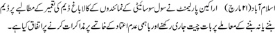 Islamabad, March 21; Talks on whether or not Kalabagh dam should be constructed moved forward when Parliamentarians agreed to the demand of civil society�s representatives to construct Kalabagh dam and to continue dialogue to help remove trust deficit. |