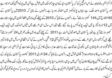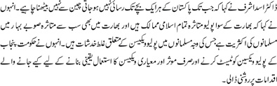 Dr. Asad Ashraf believed that until all children of Pakistan are not vaccinated we should not relax. He said all the countries except 3 Muslim countries are polio-free except India and in India the most hit province is Bihar which is a Muslim majority province. He believed that it is because of misperceptions among Muslims regarding polio vaccine. He especially shed light on Government of Punjab�s lead in testing polio vaccination and then making sure only effective and quality vaccine is used in Pakistan.