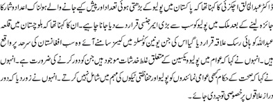 Dr. Abdul Khaliq Achakzai, believed that of the spread of polio in Pakistan should be declared as the most important national emergency. He believed that in Balochistan, Qilla Abdullah is marked as high risk area because it is on the border of Afghanistan and the union councils in which these cases were reported, all are on the border. He believed that the people have misconceptions about polio vaccination which need to be addressed. He said that health department never involves public representatives in immunization campaigns. He stressed that far flung and border areas should be given special attention. |