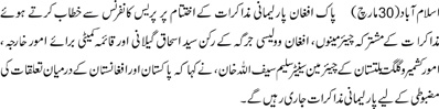 Islamabad; March 30, Addressing a press conference upon the conclusion of the Parliamentarians Dialogue, co-chairs of the Pak-Afghan Parliamentary Dialogue Sayed Ishaq Gailani, Member of Afghan Wolesi Jirga and Senator Salim Saifullah Khan, Chairman Senate Standing Committee on Foreign Affairs, Kashmir Affairs and Gilgit Baltistan, said that Parliamentary dialogue between Pakistan and Afghanistan must continue in order to strengthen Pak-Afghan ties. |