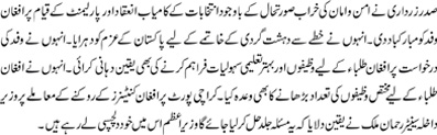 Mr. Zardari felicitated Afghan delegation for holding of successful elections and establishing a Parliament despite war and law and order situation in Afghanistan. The President pledged Pakistan�s support to Afghanistan in eradicating the roots of terrorism in the region. He also promised scholarships and better education opportunities for Afghan nationals in response to requests by Afghan delegates. He also assured Afghan Parliamentarians that quota of Afghan students in Pakistani educational institutions will be increased. Responding to the concerns of delegates about containers stopped at Karachi, Senator Rahman Malik, Federal Minister for Interior, promised that the issue will be resolved very soon as the Prime Minister of Pakistan has taken personal interest in this matter.