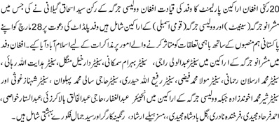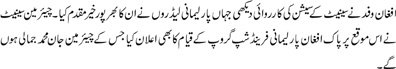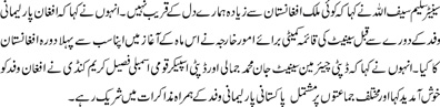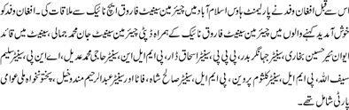 The Afghan delegation, while viewing proceedings of the House in the Senate, was warmly acknowledged and welcomed by Parliamentary leaders. Chairman Senate also announced the formation of a Pak-Afghan Parliamentary Friendship Group in Senate with Deputy Chairman Senate Senator Jan Muhammad Jamali as the Chairman of the Group. |