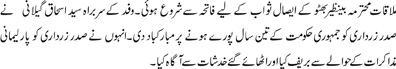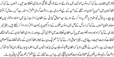 The meeting started with the fateha for the departed soul of Mohtarma Benazir Bhutto Saheed. Sayed Ishaq Gailani, Member Wolesi Jirga and leader of Afghan Parliamentary delegation, congratulated Mr. Zardrai for successfully completion of 3 years of democratic government. He briefed the President about the proceedings of the Parliamentarians Dialogue held earlier in the day and major concerns discussed by both sides.