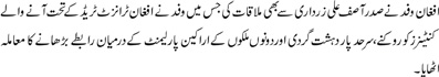 In a meeting of the Afghan Parliamentary delegation with the President of Pakistan Mr. Asif Ali Zardari, the delegates raised the issues of held containers under Afghan Transit trade, cross-border terrorism and greater Parliamentary interaction between Pakistan and Afghanistan.