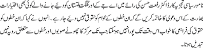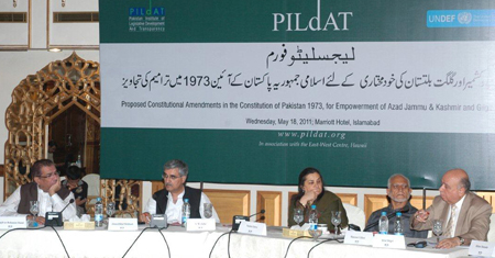 Dr. Riffat Hussain, chairman Defence and Strategic Studies Dept. QAU, was of the view that any effort to empower people of AJK and GB would undermine India�s stance against us of not giving rights to those areas. He said that autonomy to these areas can not be achieved unless constitutional provisions are enforced in letter and spirit.
