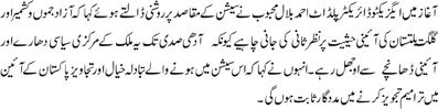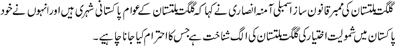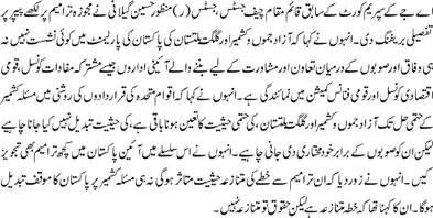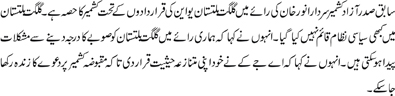 Sardar Mohammad Anwar, former President of AJK, was of the view that Gilgit Baltistan is a part of the larger Kashmir under UN resolution. GB has never had a political system in place. Our contention was that giving provincial status to GB would lead to complications. He said that people of AJK voluntarily declared themselves to be a disputed territory so as to keep the claim alive on the Indian held Kashmir.