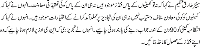 Honouarble Senator Tariq Azeem said that neither standing committees have any funds and nor political parties have any research and analyses wings. He said that committees have no support staff and have no power for the implementation of recommendations. He said that Executive should bound to respond in 90 days to Committees� recommendations. He suggested that it should be mandatory for NGOs to show clearly from where they get their funds.
