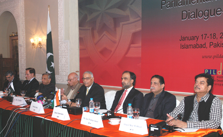 Pakistani MPs who joined the two-day Dialogue included Senator Ishaq Dar (Punjab, PML-N), Senator Saeeda Iqbal (ICT, PPPP), Senator Tariq Azeem Khan (ICT, PML), Senator Hasil Khan Bizenjo (Balochistan, NP), Senator Dr. Abdul Malik, (Balochistan, NP), Senator Sabir Ali Baloch (Balochistan, PPPP), Senator Abdul Haseeb Khan (Sindh, MQM), Mr. Humayun Saifullah Khan, MNA, (NA-27Lakki Marwat, Khyber Pakhtunkhwa, PML), Lt. Gen. (Retd.) Abdul Qadir Baloch, MNA (NA-271 Kharan-cum-Panjgur, Balochistan, PML-N), Mr. Ayaz Amir, MNA (NA-60, Chakwal-I, Punjab, PML-N), Dr. Farooq Sattar (MNA, NA-249, Karachi-XI, Sindh, MQM), Ms. Fouzia Ejaz Khan, MNA, (NA-317-Sindh-X, MQM), Ms. Imrana Saeed Jamil, MNA, (NA-318, Sindh-XI, Sindh, MQM), Mr. Khurram Dastgir Khan, MNA, (NA-96, Gujranwala-II, Punjab, PML-N), Ms. Khushbakht Shujaat, MNA, (NA-250, Karachi XII, Sindh, MQM), Mr. Kishan Chand Parwani, MNA, (NA-341, Non-Muslim-IX, PML), Dr. Lal Chand, MNA (NA-335, Non-Muslim-III, Sindh, PPPP), Mian Abdul Sattar, MNA, (NA-193 R.Y.Khan-II, Punjab, PPPP), Nawabzada Malik Amad Khan, MNA, (NA-71 Mianwali-I, Punjab, PPPP), Ch. Naseer Ahmed Bhutta, MNA, (NA-127, Lahore-X, Punjab, PML-N), Dr. Nahid Shahid Ali, MNA, (NA-315, Sindh-VIII, MQM), Begum Nuzhat Sadiq, MNA, (NA-277, Punjab-V, PML-N), Mr. Riaz Fatyana, MNA, (NA-94, T.T. Singh-III, Punjab, PML), Mr. Sajid Ahmad, MNA (NA-257, Karachi-XIX, Sindh, MQM), Mr. Shahid Khaqan Abbasi, MNA, (NA-50, Rawalpindi-I, Punjab, PML-N), Ms. Shahnaz Wazir Ali, MNA, (NA-290, Punjab-XVIII, PPPP), Mr. Abdul Rasheed Godil, MNA, (NA-252 Karachi XIV, Sindh, MQM), Ms. Shireen Arshad Khan, (NA-283, Punjab-XI, PML-N), Ms. Tasneem Sidiqui, MNA, (NA-285, Punjab-XIII, PML-N), Ms. Parveen Masood Bhatti, (NA-281, Punjab-IX, PML-N), Mr. Nadeem Afzal Gondal, MNA (NA-64, Sargodha-I, Punjab, PPPP), Dr. Ayatullah Durrani, MNA (NA-268, Kalat-cum-Mastong, Balochistan, PPPP), Ms. Palwasha Behram Khan, MNA (NA-291, Punjab- XIX, Punjab, PPPP), Mr. Abid Sher Ali, MNA (NA-84, Faisalabad-V, Punjab, PMLN), Syed Asif Hasnain, MNA (NA-255, Karachi-XVII, Sindh, MQM), Syed Haider Abbas Rizvi, MNA (NA-253, Karachi-XV, Sindh, MQM), Pir Aftab Hussain Gillani, MNA (NA-226, Mirpurkhas-cum-Umerkot-I, Sindh, PPPP), Justice (Rtd) Fakhar-un-Nisa Khokhar, MNA, (NA-295, Punjab- XXIII, Punjab, PPPP), Ms. Asiya Nasir, MNA ( NA-322, Balochistan III, MMA)and Ms. Shahnaz Saleem, MNA, (NA-280, Punjab-VIII, PML-N).