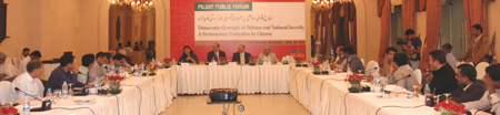 Speakers at the Citizens Forum included Senator Mushahid Hussain Sayed, Chairman Senate Defence Committee in the chair, Mr. Shahid Hamid, senior Advocate Supreme Court; former Defence Minister, Senator Haji Muhammad Adeel, Vice Chairman ANP and Chairman Senate Standing Committee on Foreign Affairs and Ms. Aasiya Riaz, Joint Director PILDAT. |